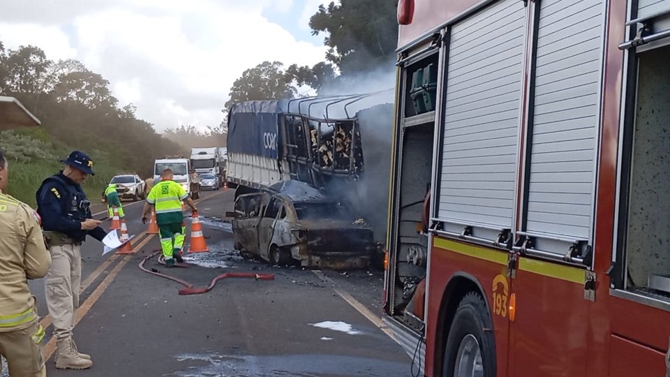 Batida envolvendo carro e carreta deixa duas vítimas carbonizadas